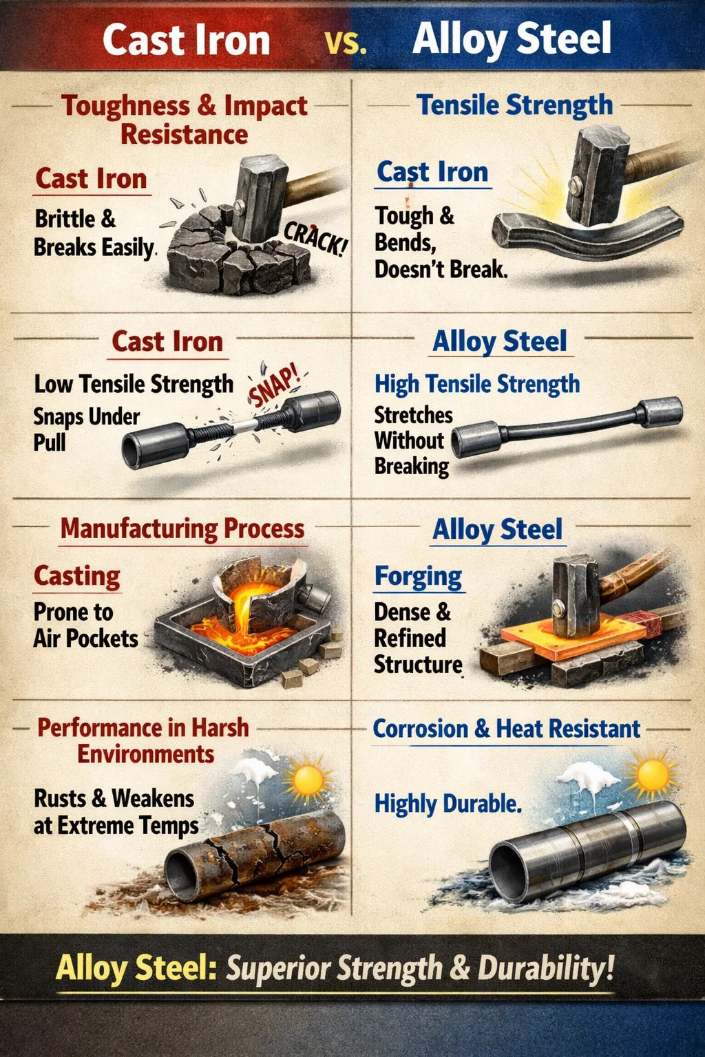 El acero aleado es generalmente más resistente y duradero que el hierro fundido, especialmente cuando se somete a impactos, tensiones y fuertes presiones. Si bien el hierro fundido tiene sus puntos fuertes en ciertas aplicaciones específicas (como la fabricación de ollas o bases de máquinas herramienta), el acero aleado es el material superior en términos de rendimiento general.