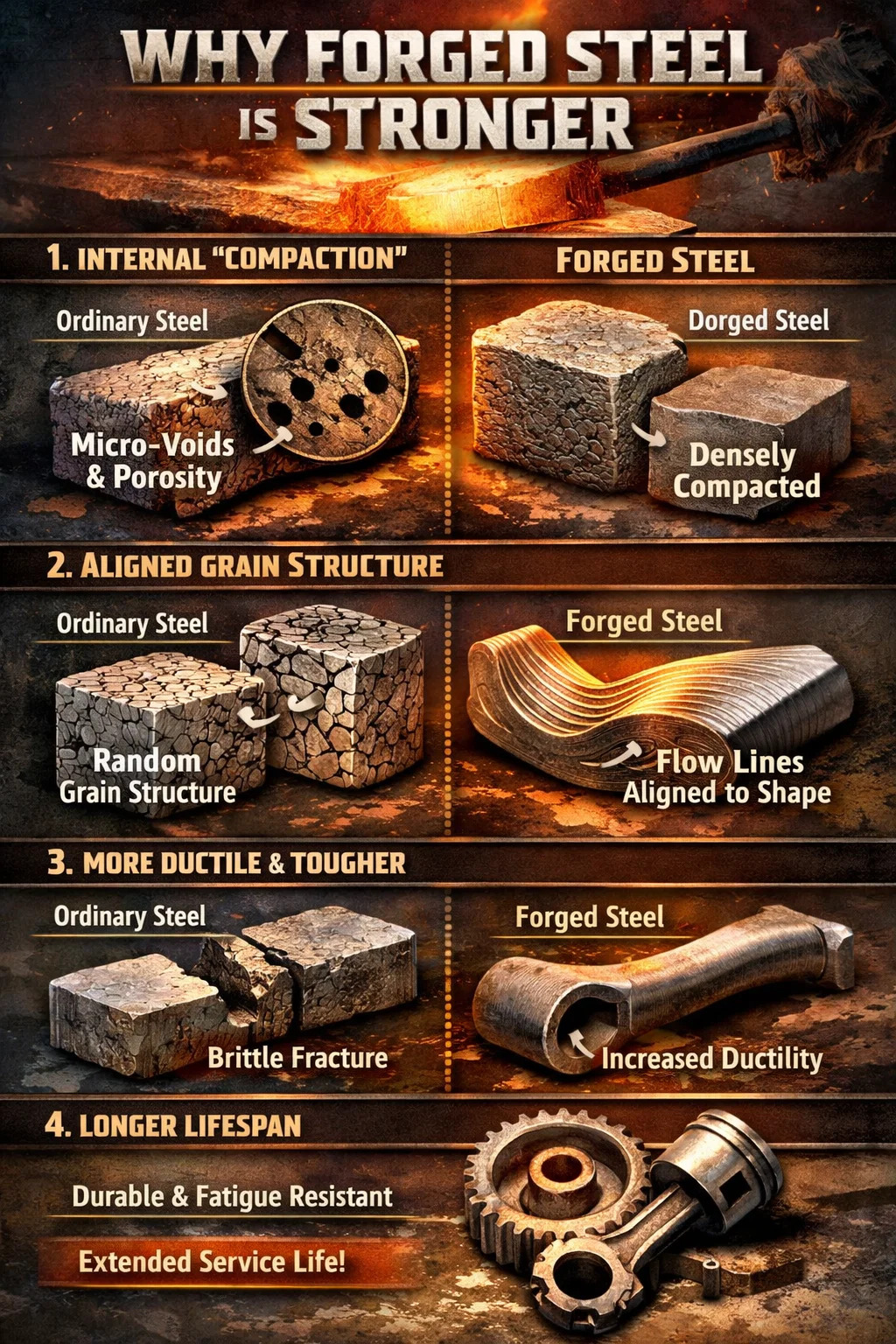 Acero forjado: bajo una inmensa presión, estos pequeños poros se aplanan por completo y se sueldan entre sí, haciendo que toda la pieza de metal sea tan densa como un bloque sólido. Sin defectos internos, la pieza es naturalmente más fuerte.