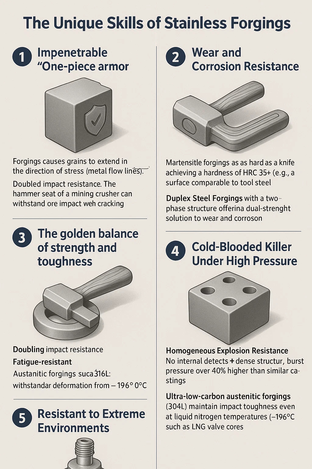 Irrompible: la forja compacta completamente los poros y la contracción, sin dejar espacio para que entren medios corrosivos: las piezas fundidas son como esponjas, las forjadas son como lingotes sólidos.