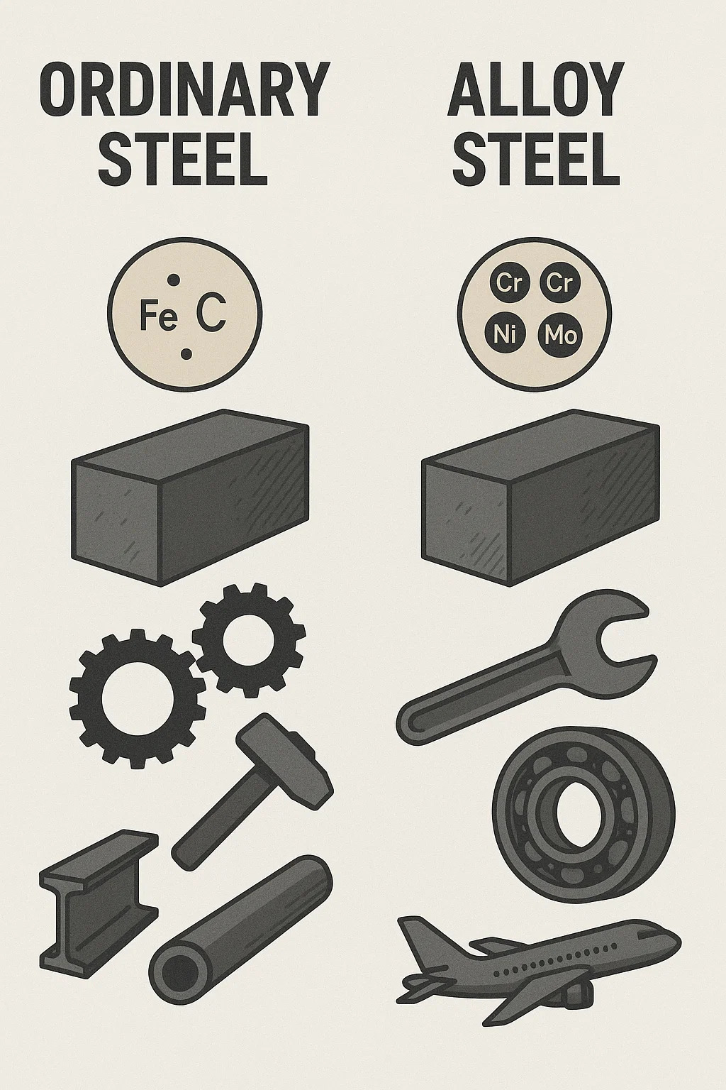 El acero aleado se fabrica agregando otros elementos metálicos o no metálicos al acero ordinario (hierro y carbono), como agregar varios "ingredientes funcionales" al acero.