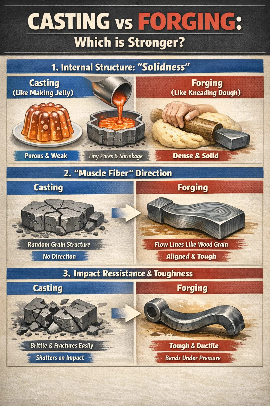 Si comparamos el metal con los ingredientes alimentarios, la fundición es como "hacer gelatina", mientras que forja de acero Es como "amasar masa". Aunque ambos pueden crear la forma deseada, la densidad interna y la resistencia al impacto son completamente diferentes.