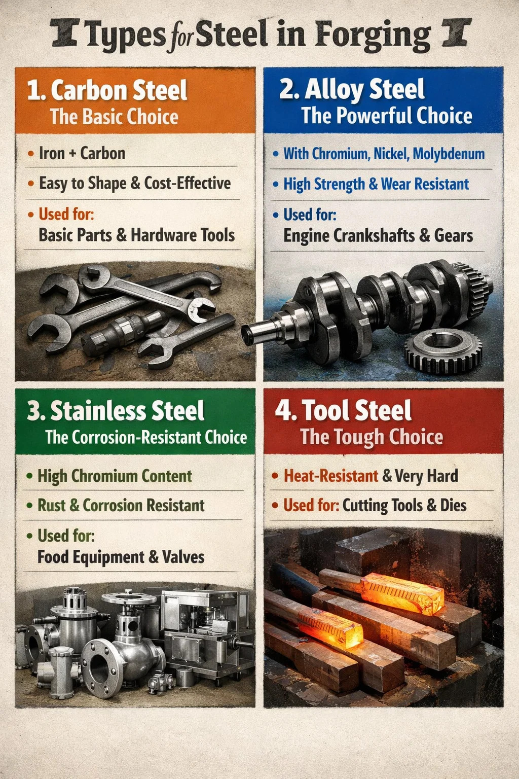 En la producción industrial real, no todo el acero es adecuado para "calentarlo y martillarlo". Para garantizar que las piezas resultantes sean resistentes y duraderas, forja de acero Normalmente utiliza los siguientes tipos principales de acero, según la aplicación:
